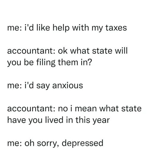 I think it's great. It's funny, it's witty. [editor’s note: i’ve gotten all the validation i need for the rest of the year 😌] You open up and share your feelings. Like the... What was that tax joke? What state did you file your taxes in?